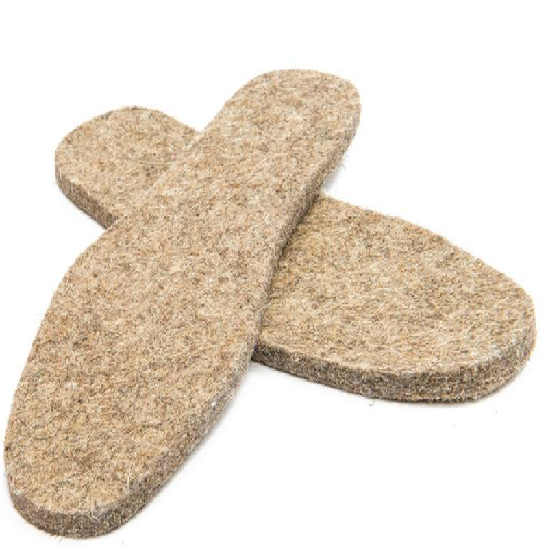 2. 毛氈鞋墊加工工藝:選毛、洗毛、梳毛、鋪網(wǎng)、加溫過平板、縮絨、對輥、整平、烘干、硫化定型、刀模裁切等11道工藝。厚度適中不變形、密度高,不皺褶、不掉毛、易晾干、不會影響鞋子外觀,是冬季保暖用品。